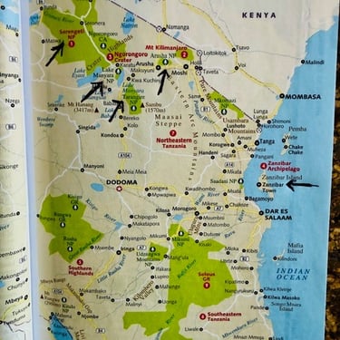 We are off to Tanzania early tomorrow morning. Barbara has been on safari to East Africa many years ago. Some of her 1991 photographs are shown below. The word “safari” means journey and for the next 21 days we will only be visiting a small section of this amazing and wild place (see map). No guns on our safari only cameras. Our visit starts in Arusha, a town at the foot of Mount Kilimanjaro. We will then begin our exploration of Northern Tanzania.
